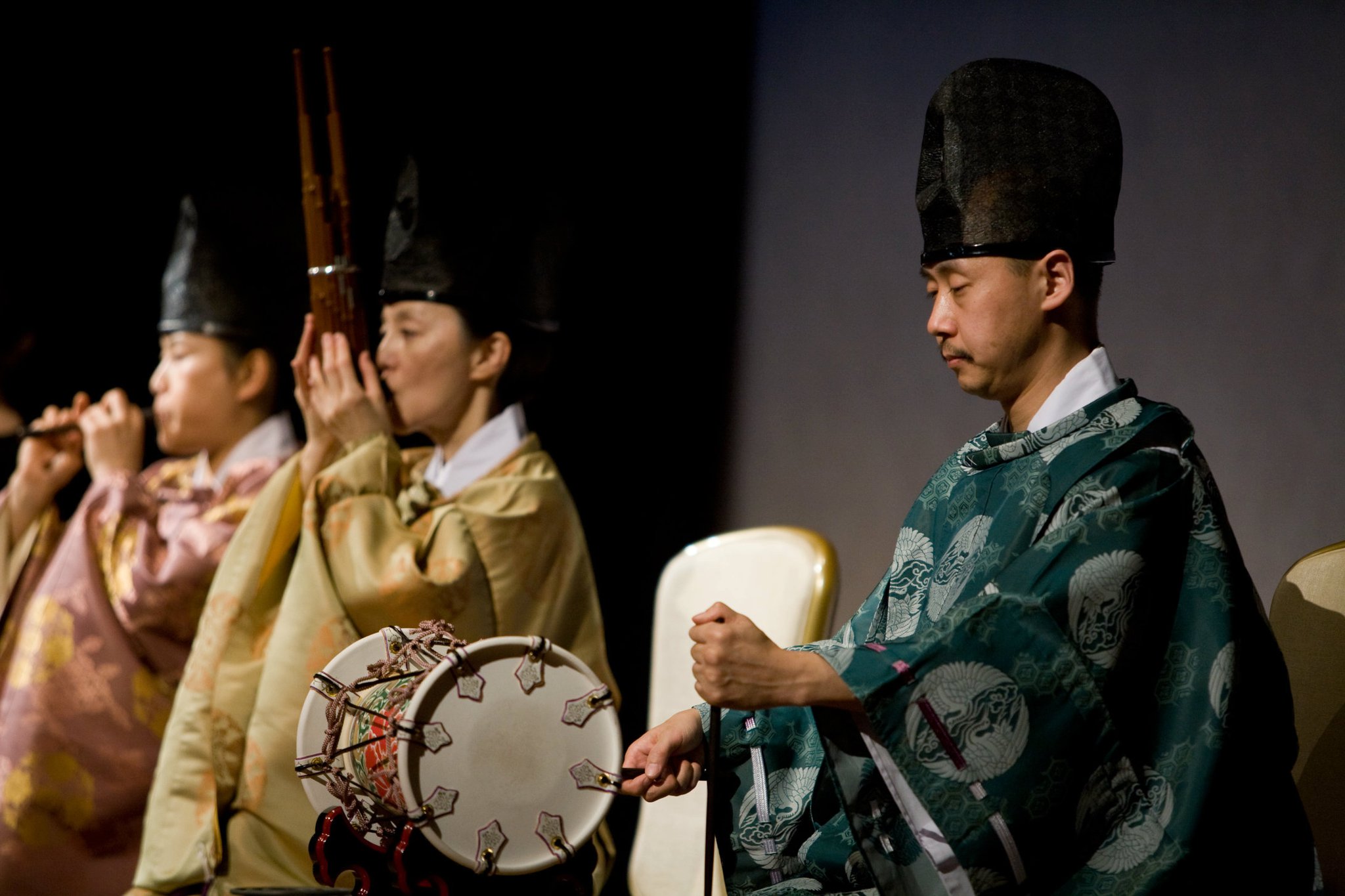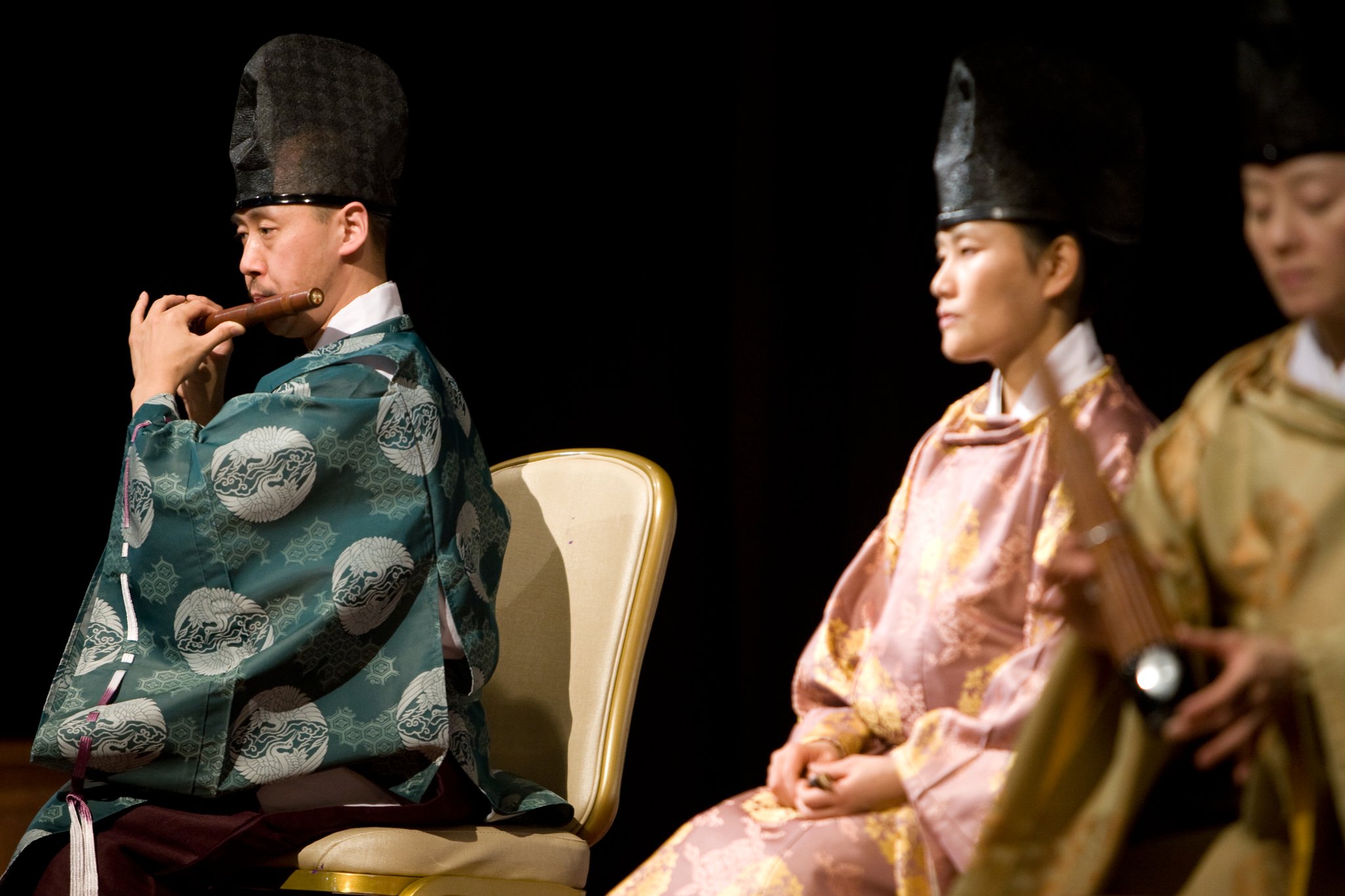 Until at least the 1960’s, due in great part to the Imperial Household Agency’s mission to preserve permanently musical forms that are more than a millennium old, gagaku musical traditions were transmitted as faithfully as possible to their originals. Over the past few decades, however, some imperially-trained musicians have become increasingly aware that preservation alone is not enough to keep an art alive. Pioneers such as former Imperial Household Music Department member Sukeyasu Shiba, who created the Reigakusha gagaku ensemble outside of the court, have held an important role in training new artists. His and other similar ensembles are impacting the present-day international musical scene with their performances of gagaku compositions, both classic and contemporary.