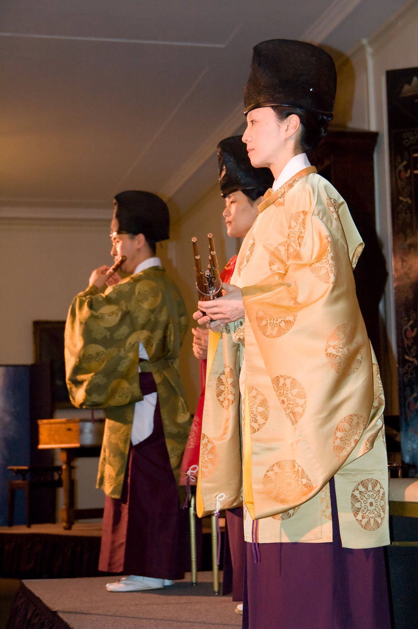 Leading gagaku artists are invited from Japan to perform at our New York concerts. Members of the renowned gagaku ensemble Reigakusha, such Mayumi Miyata (shō), Hitomi Nakamura (hichiriki), and Takeshi Sasamoto (ryūteki), have presented pieces from the classical repertory as well as contemporary compositions for the ancient gagaku instruments. The concerts are an important showcase for newly-commissioned works for gagaku instruments. At the March 2006 and February 2007 concerts, new compositions by Hiroya Miura, commissioned by the Institute for Medieval Japanese Studies, were given their world premieres. These musical gatherings are also an opportunity for collaboration between musicians and artists from Japan and the United States, as well as between performers of eastern and western instruments. In November 2006, the gagaku musicians and bugaku dancers of the Ono Gagaku Society of Tokyo performed with Shrine Celebrant Kagura Dancers from the International Shinto Foundation in New York.
