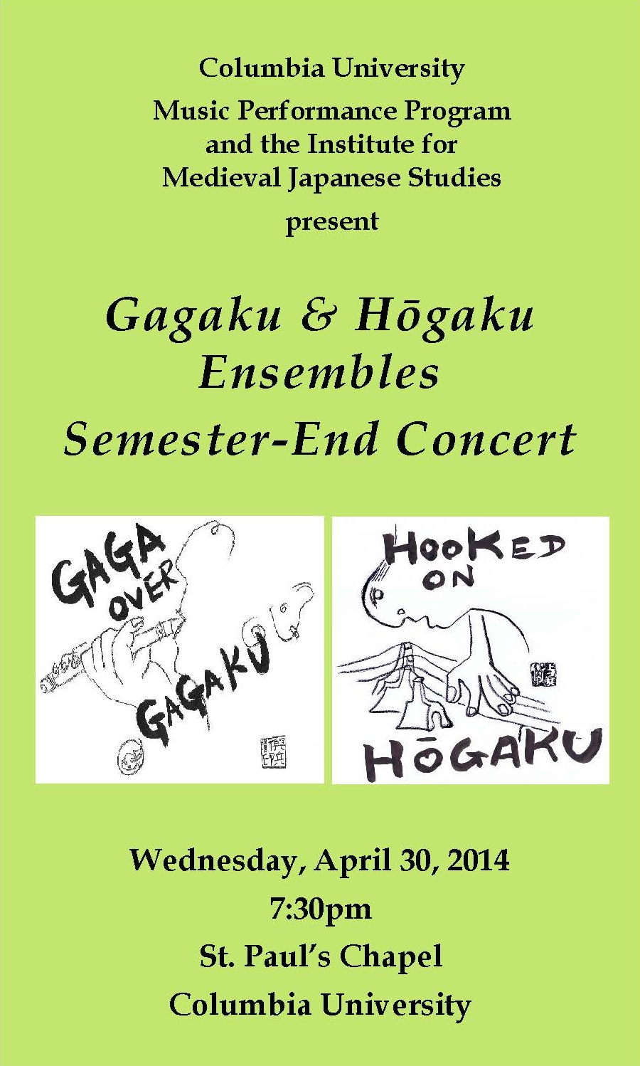 In conjunction with the Gagaku-Hōgaku Classical Japanese Music Curriculum and Performance Program at Columbia University, launched in September 2006, the Institute for Medieval Japanese Studies presents several public gagaku concerts and instrumental workshops to introduce the ancient music of Japan to a greater audience at Columbia University and in New York.